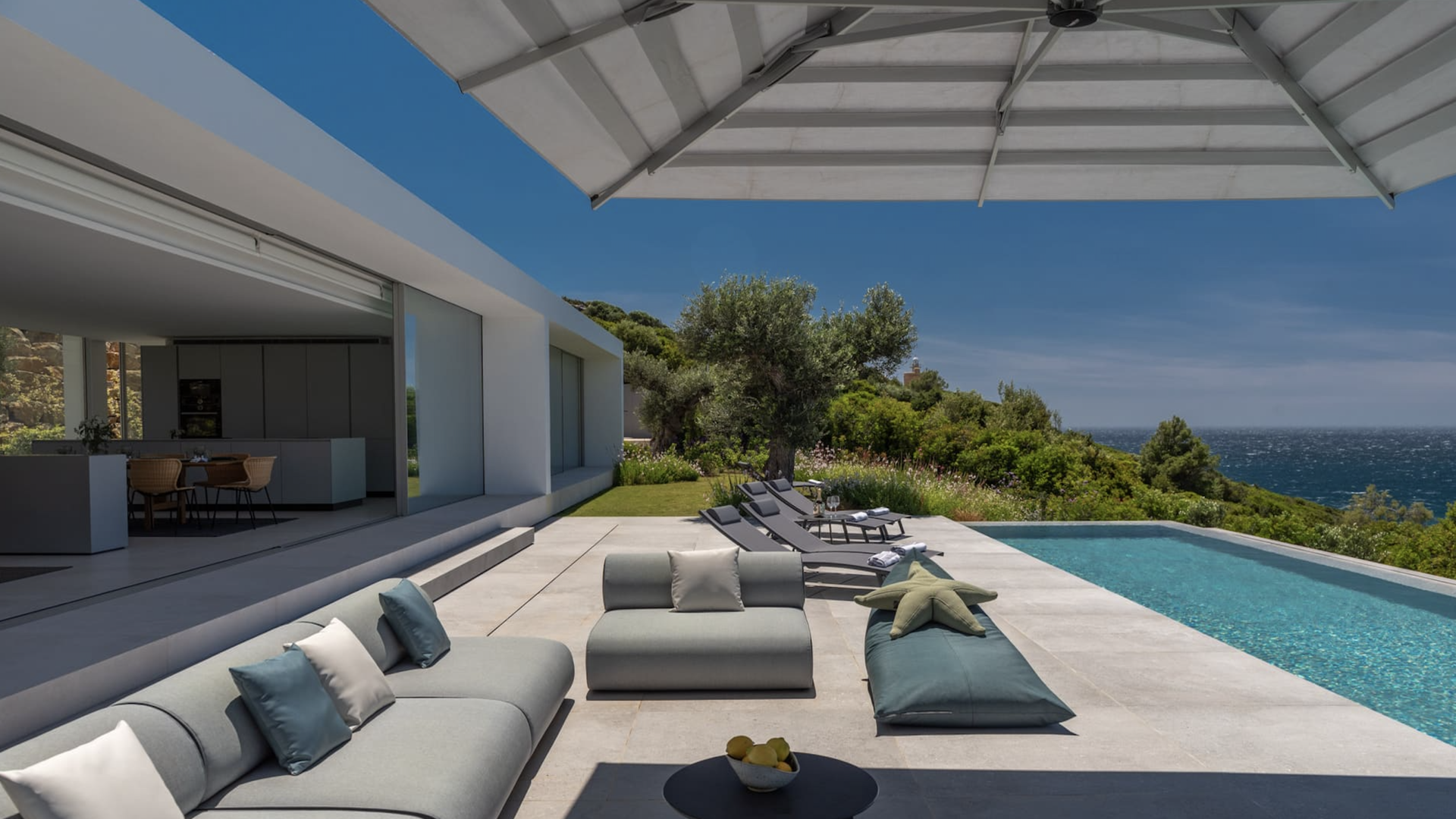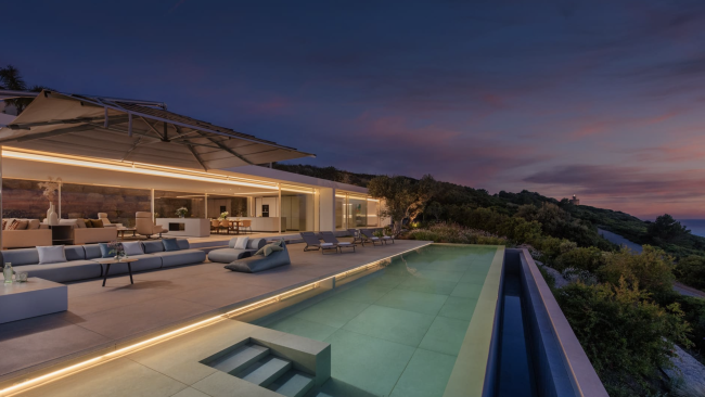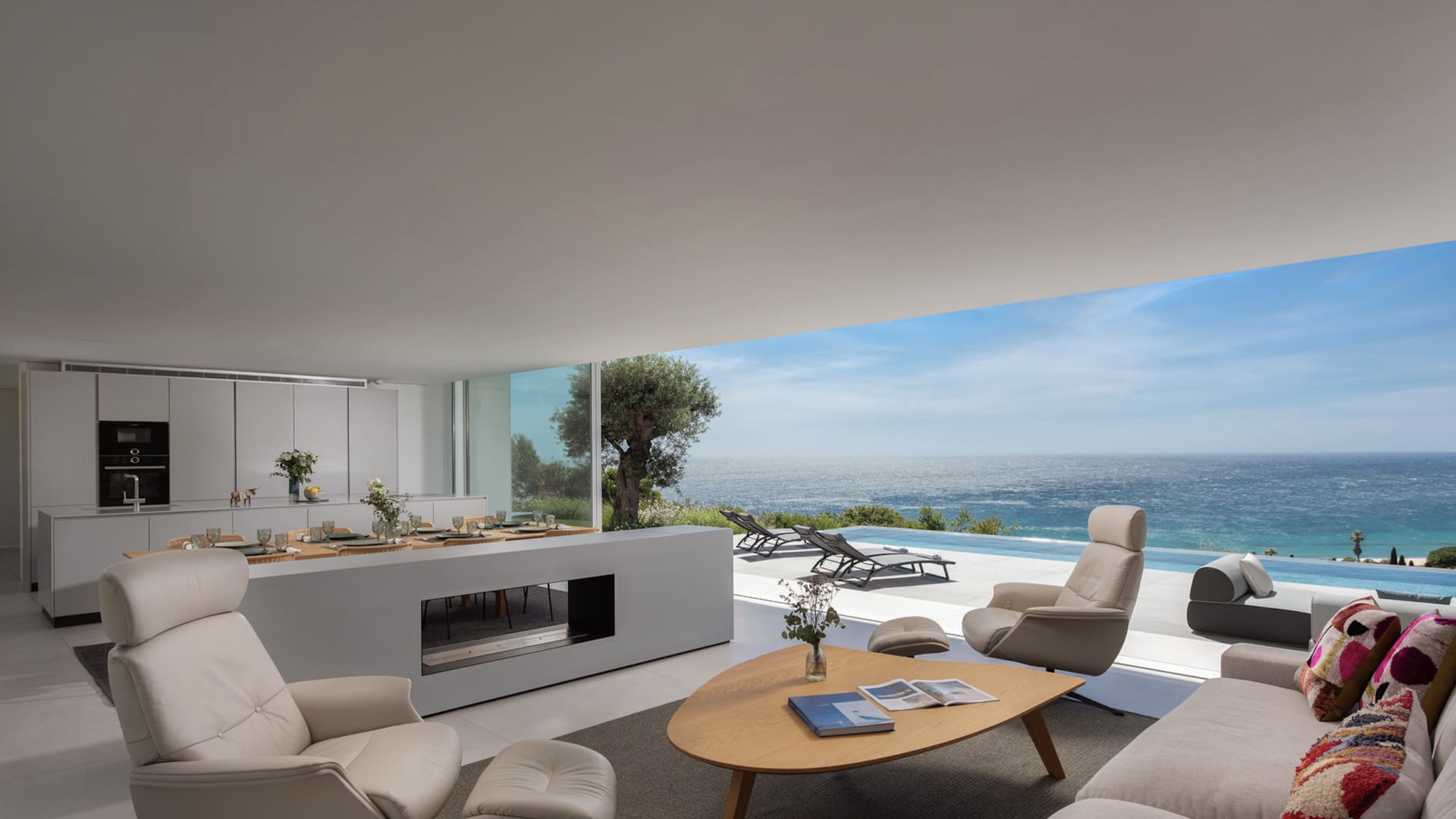 Su arquitectura de líneas puras y horizontes abiertos se funde con la naturaleza que la rodea. La piscina infinita se alinea con el mar al fondo, creando esa sensación de continuidad que invita a dejarse llevar, sin prisas. Rodeada de ventanales amplios y luz natural que entra suavemente durante todo el día, iluminando cada espacio con calidez. La distribución ha sido pensada con cariño: habitaciones en ambos extremos para mayor privacidad, y un amplio salón central donde todo fluye. Cocina moderna, totalmente equipada con electrodomésticos Bosch, comedor para diez personas y una zona de relax perfecta para leer, charlar o ver una peli en buena compañía. Las puertas de cristal se abren con solo pulsar un botón y, de repente, el mar entra en casa.