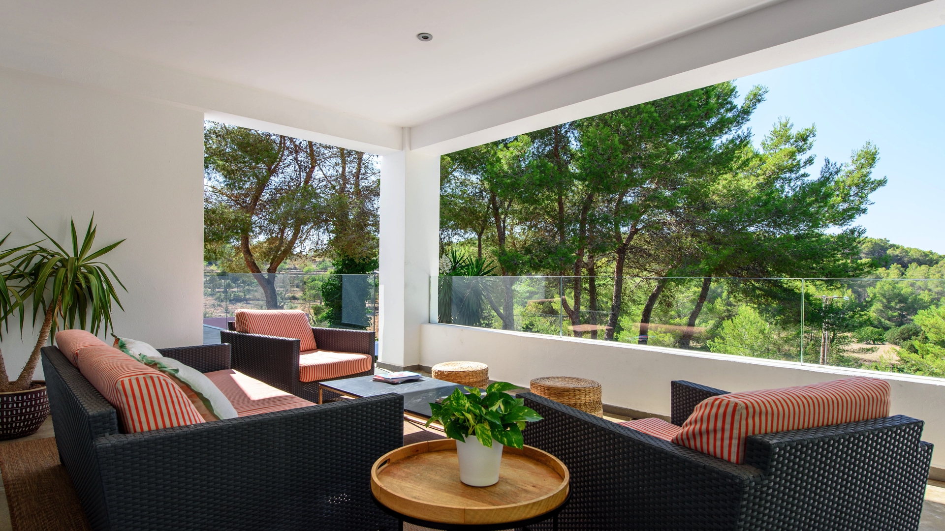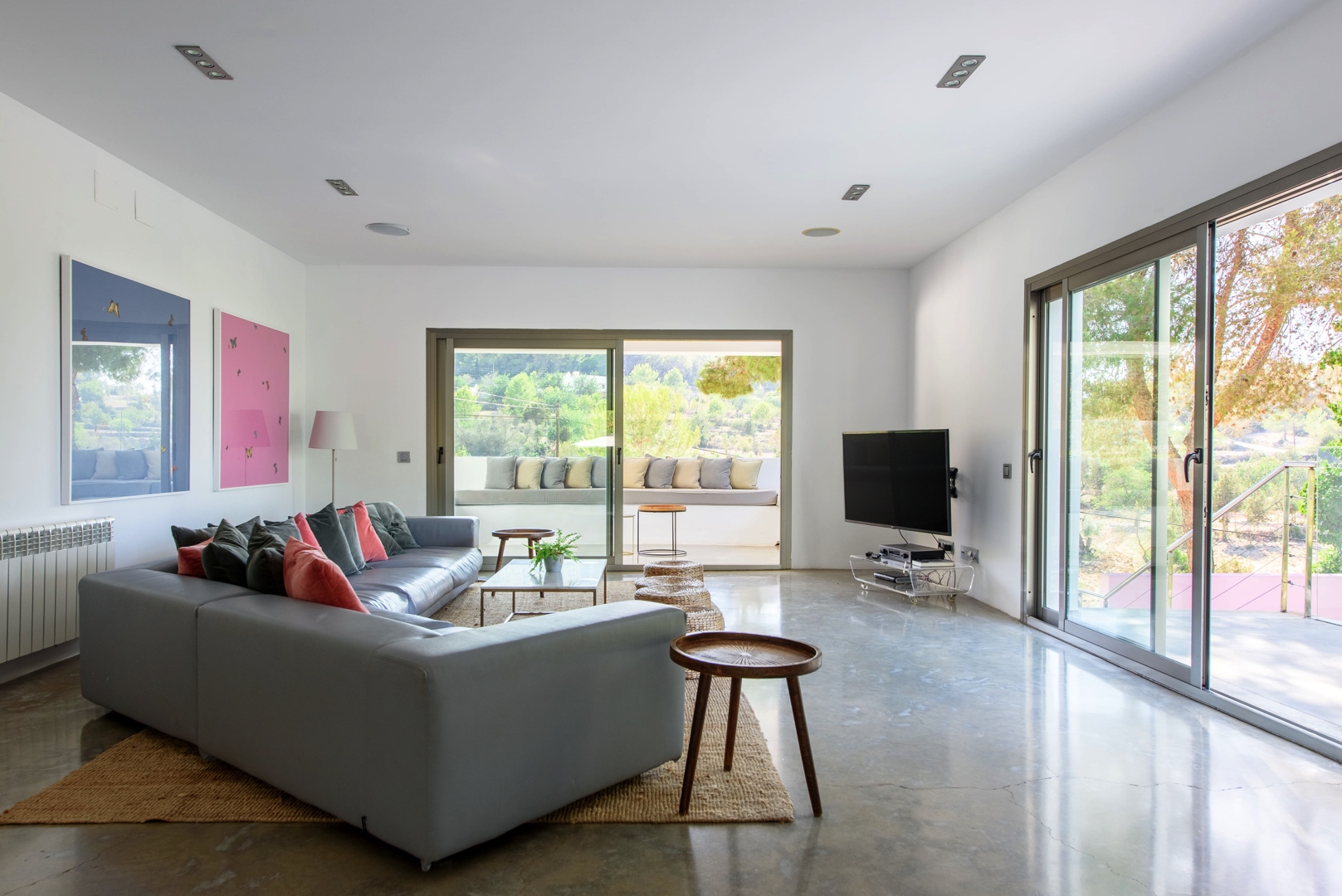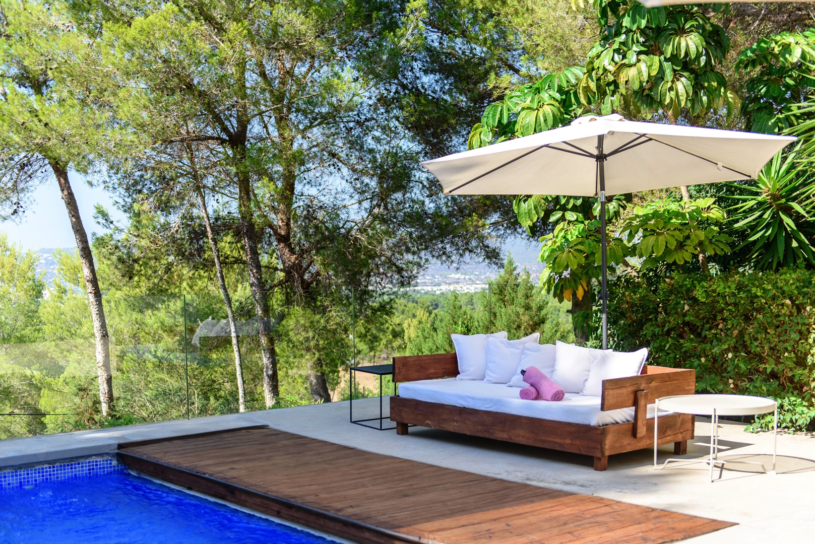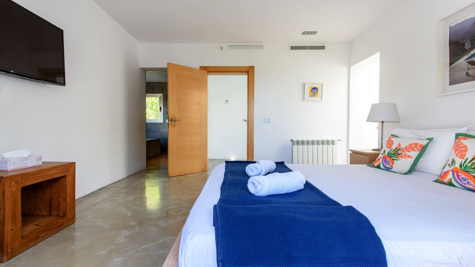 Both the house and the exteriors are in a protected area, which guarantees you incomparable tranquility and privacy and, in addition, you can enjoy the incredible walking or cycling routes in the area. If you prefer to stay and enjoy the comforts of the house, you will love its large swimming pool (12m x 4.5m) and outdoor area that includes several terraces to enjoy the views of the sea and the sunset. It has 6 double bedrooms and capacity to accommodate up to 12 people. It has a spacious living room with views in three directions furnished with an eight meter Capellini sofa, plasma TV with Sky TV, DVD player and an integrated iPod sound system plus four DAS integrated speakers. Although there is an area that we love and we have no doubt that you are going to enjoy it, it is its covered terrace equipped with Minotti pony leather armchairs and a barbecue area from where you can access both the upper garden and the pool terrace. The upper garden has been designed as an orchard with 5 different types of orange, lemon, lime, pomegranate, almond, olive and apricot trees available to customers (depending on the season).