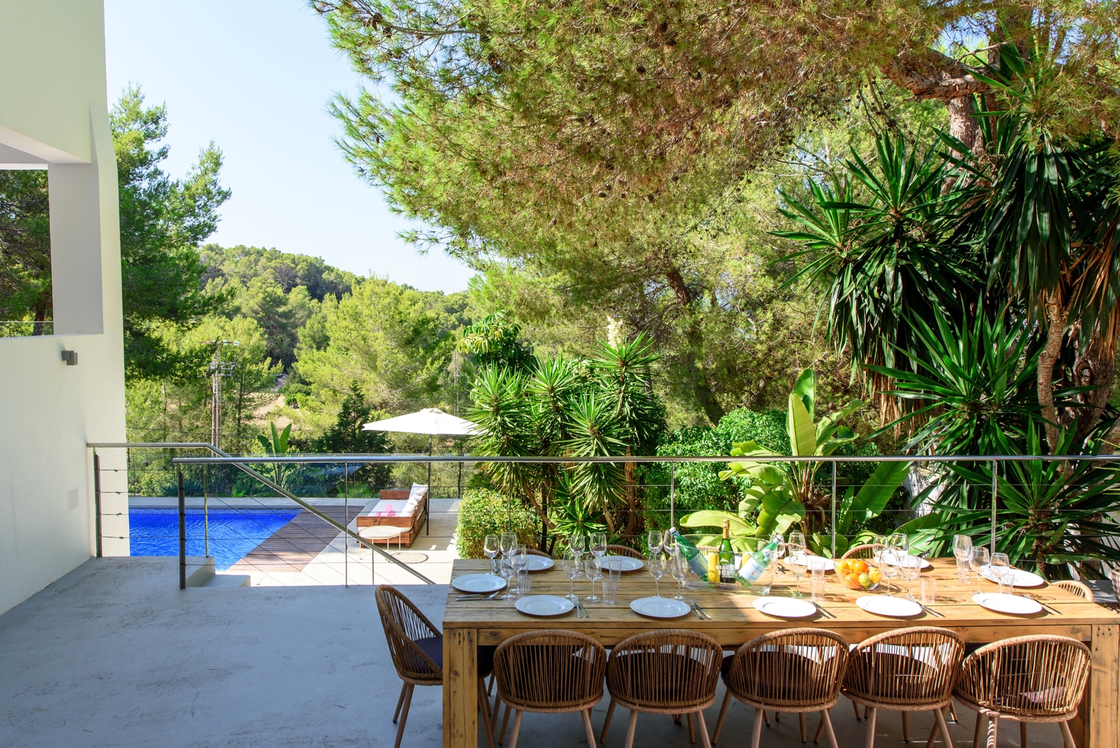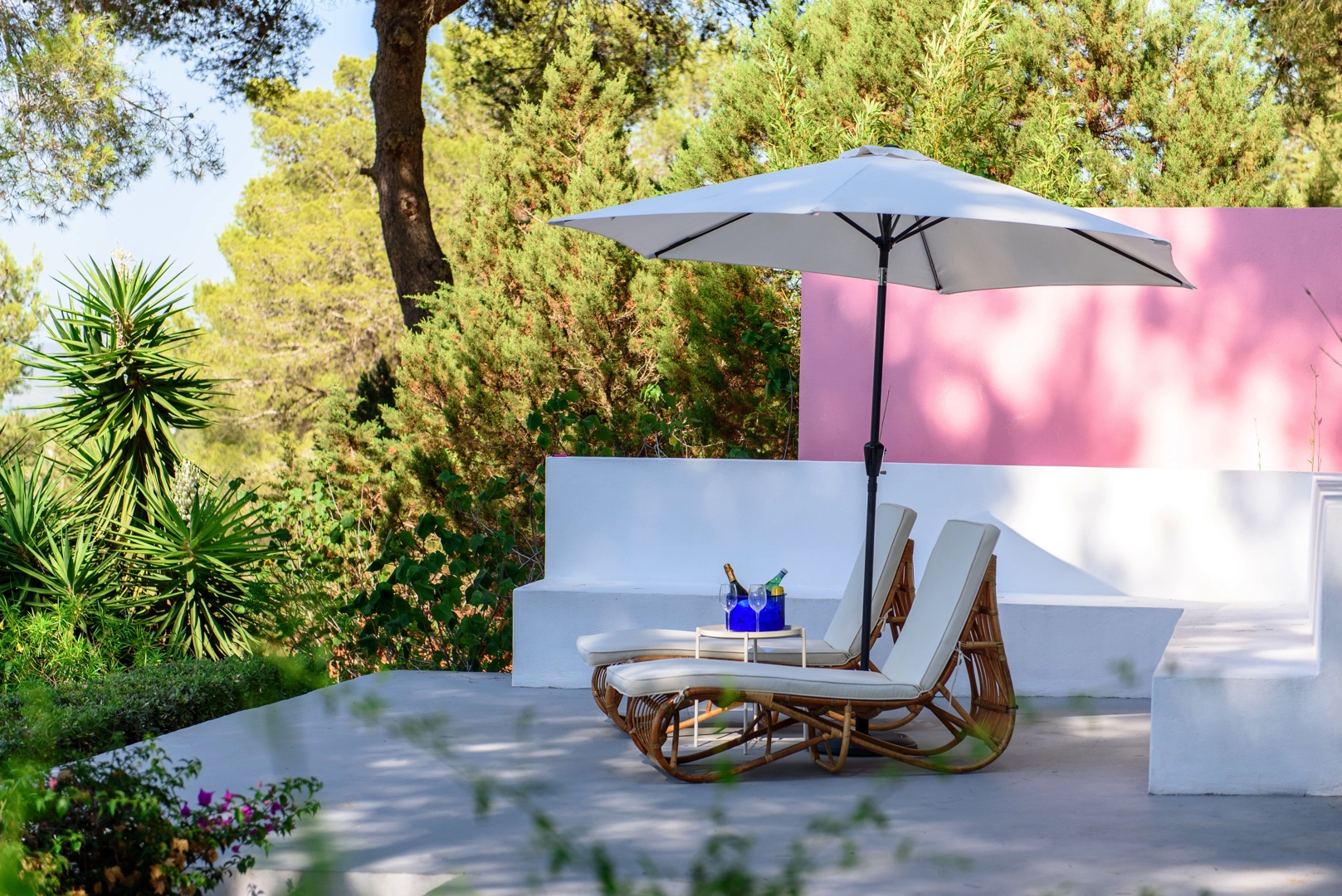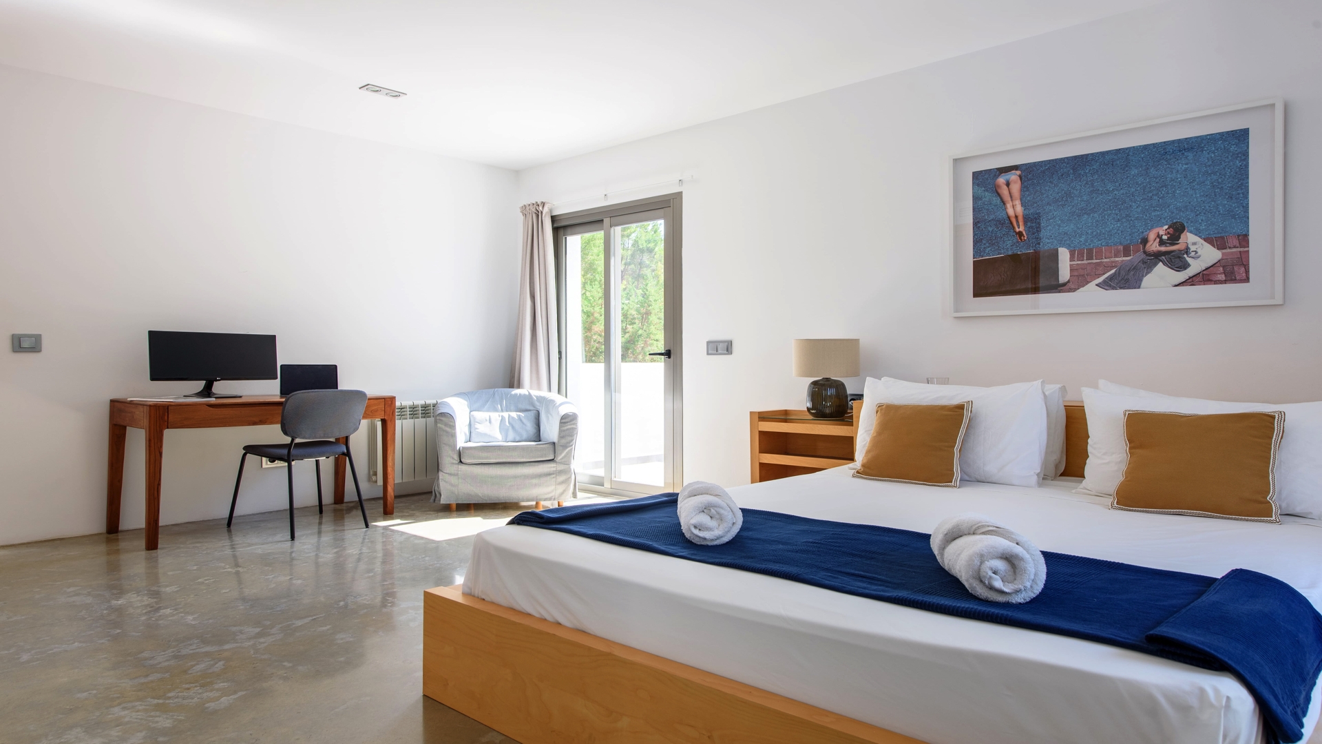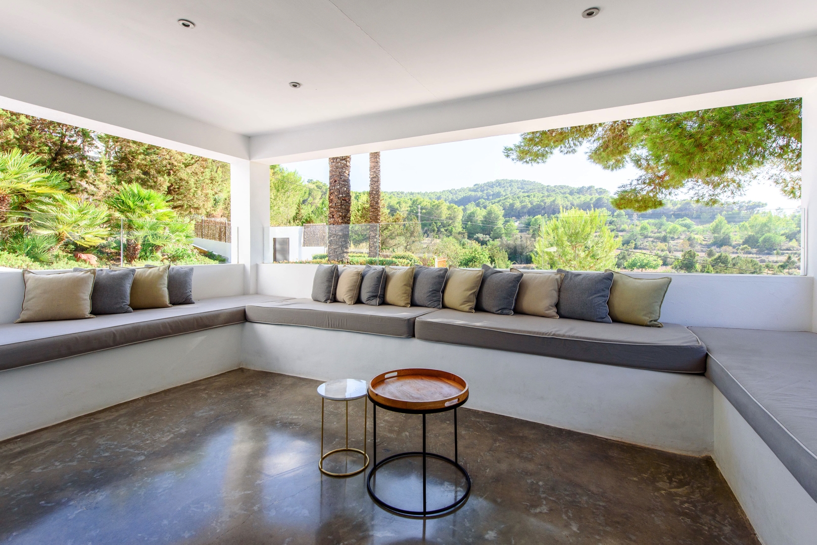 Both the house and the exteriors are in a protected area, which guarantees you incomparable tranquility and privacy and, in addition, you can enjoy the incredible walking or cycling routes in the area. If you prefer to stay and enjoy the comforts of the house, you will love its large swimming pool (12m x 4.5m) and outdoor area that includes several terraces to enjoy the views of the sea and the sunset. It has 6 double bedrooms and capacity to accommodate up to 12 people. It has a spacious living room with views in three directions furnished with an eight meter Capellini sofa, plasma TV with Sky TV, DVD player and an integrated iPod sound system plus four DAS integrated speakers. Although there is an area that we love and we have no doubt that you are going to enjoy it, it is its covered terrace equipped with Minotti pony leather armchairs and a barbecue area from where you can access both the upper garden and the pool terrace. The upper garden has been designed as an orchard with 5 different types of orange, lemon, lime, pomegranate, almond, olive and apricot trees available to customers (depending on the season).