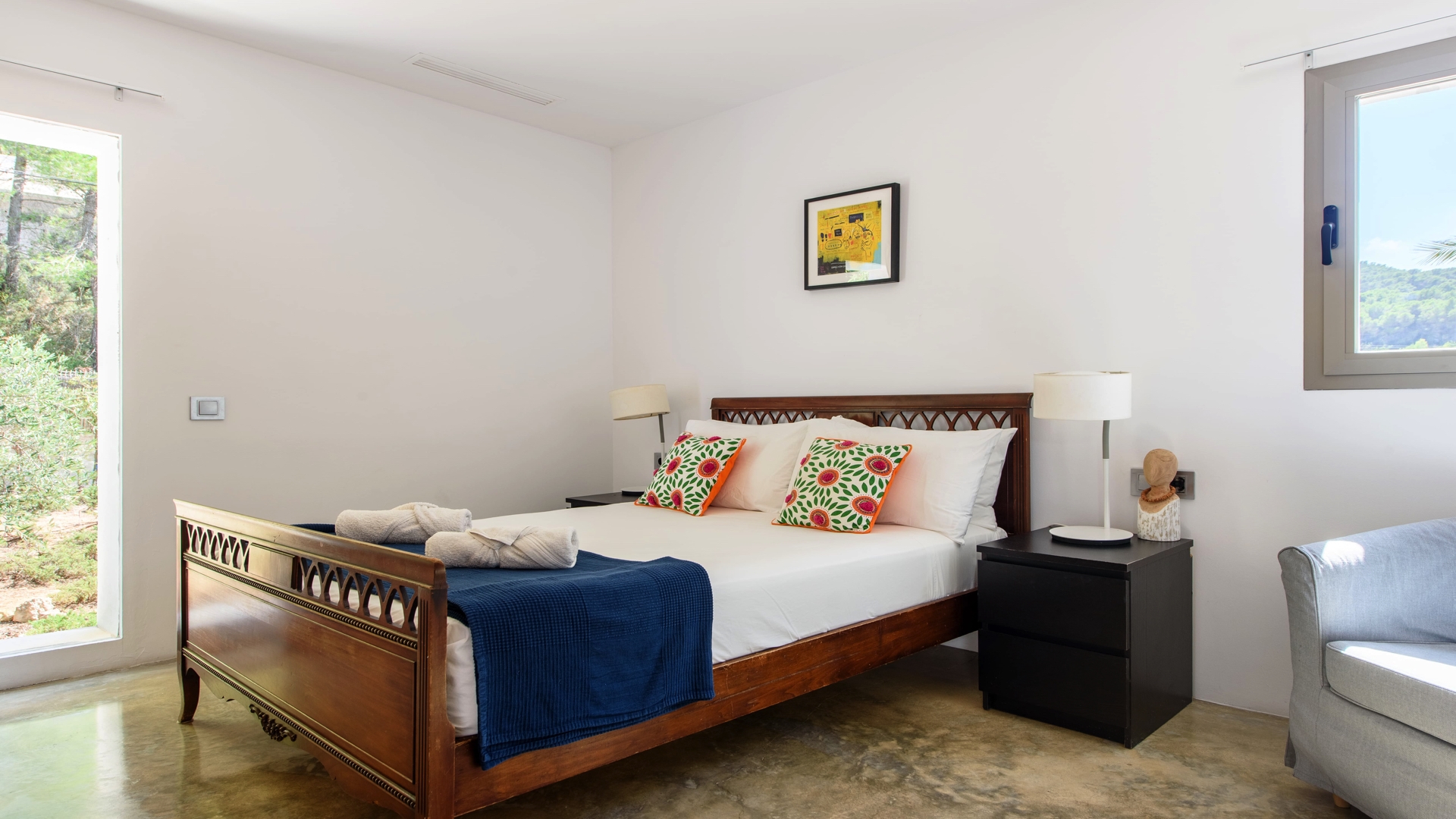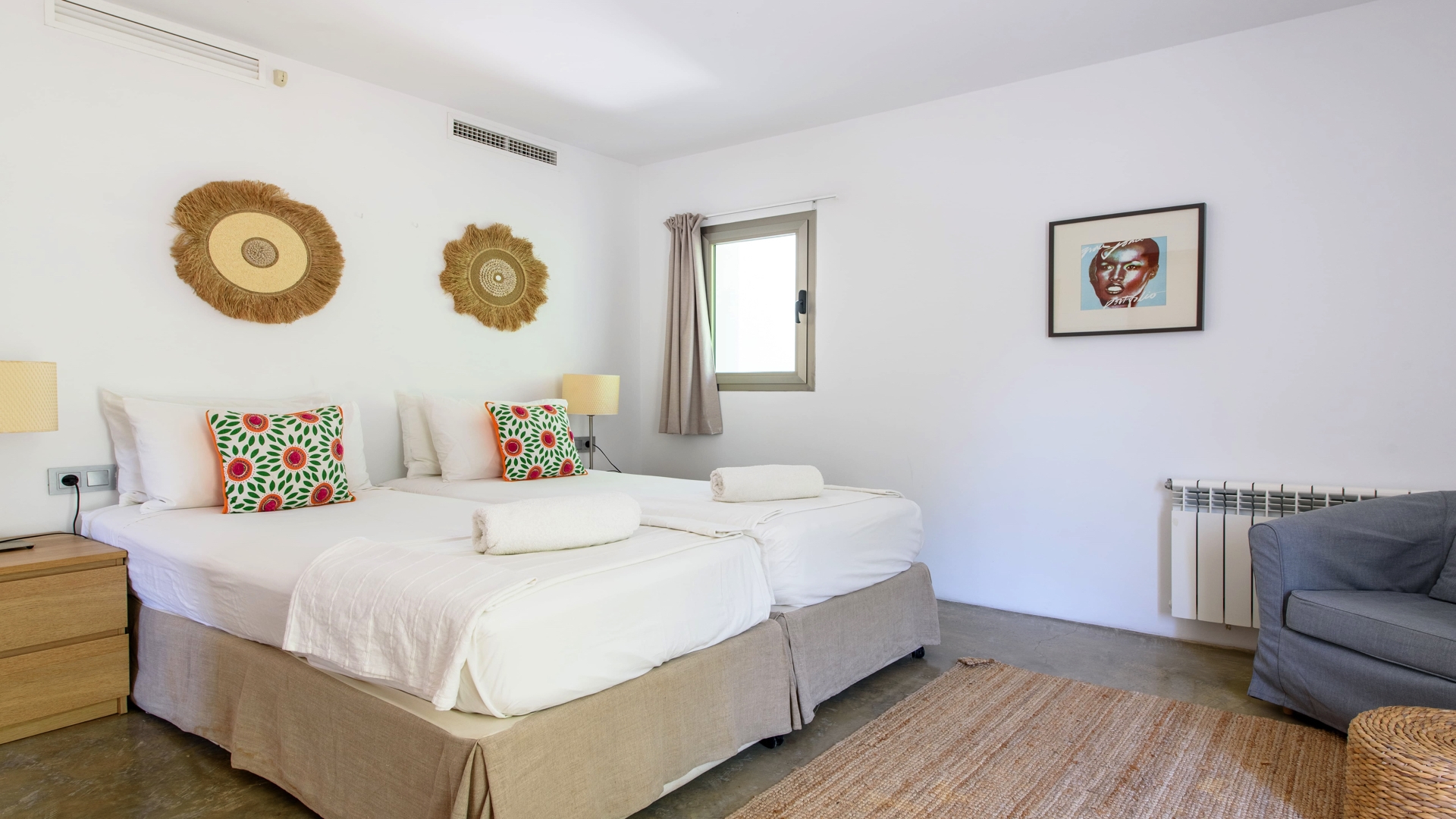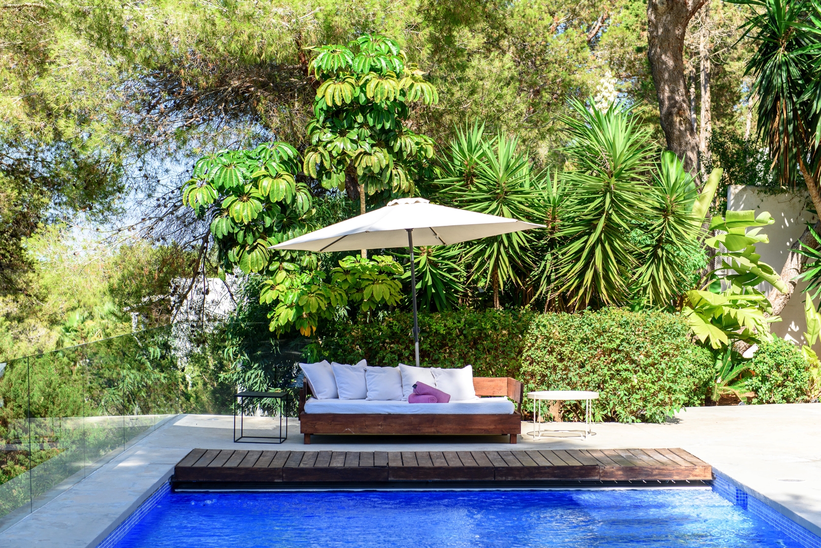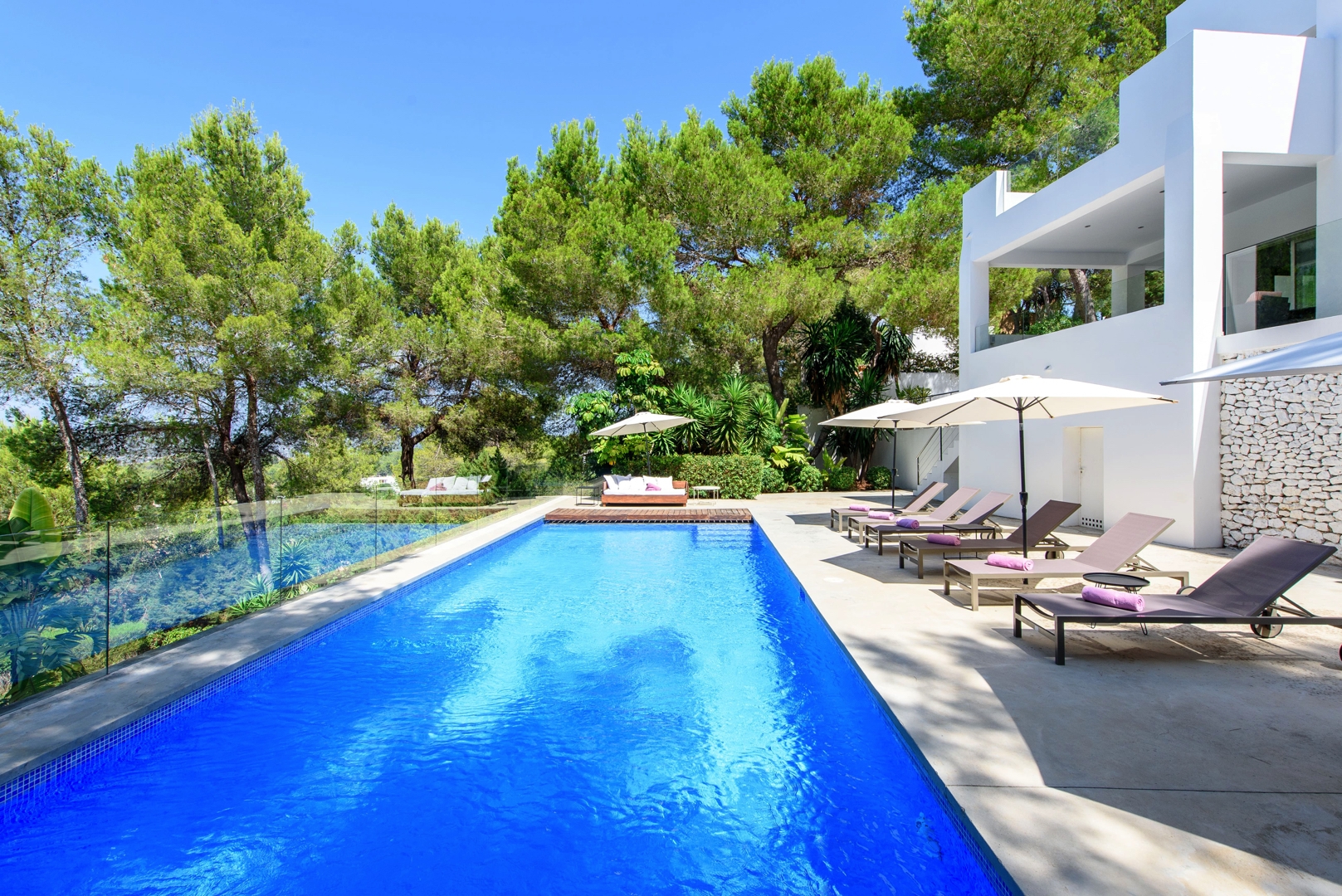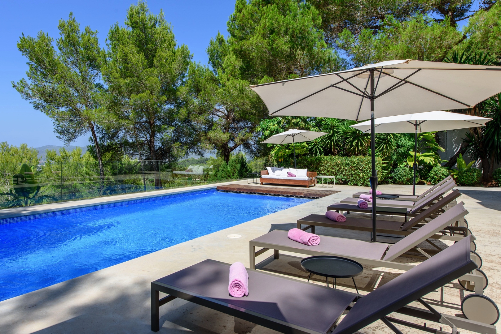 Both the house and the exteriors are in a protected area, which guarantees you incomparable tranquility and privacy and, in addition, you can enjoy the incredible walking or cycling routes in the area. If you prefer to stay and enjoy the comforts of the house, you will love its large swimming pool (12m x 4.5m) and outdoor area that includes several terraces to enjoy the views of the sea and the sunset. It has 6 double bedrooms and capacity to accommodate up to 12 people. It has a spacious living room with views in three directions furnished with an eight meter Capellini sofa, plasma TV with Sky TV, DVD player and an integrated iPod sound system plus four DAS integrated speakers. Although there is an area that we love and we have no doubt that you are going to enjoy it, it is its covered terrace equipped with Minotti pony leather armchairs and a barbecue area from where you can access both the upper garden and the pool terrace. The upper garden has been designed as an orchard with 5 different types of orange, lemon, lime, pomegranate, almond, olive and apricot trees available to customers (depending on the season).