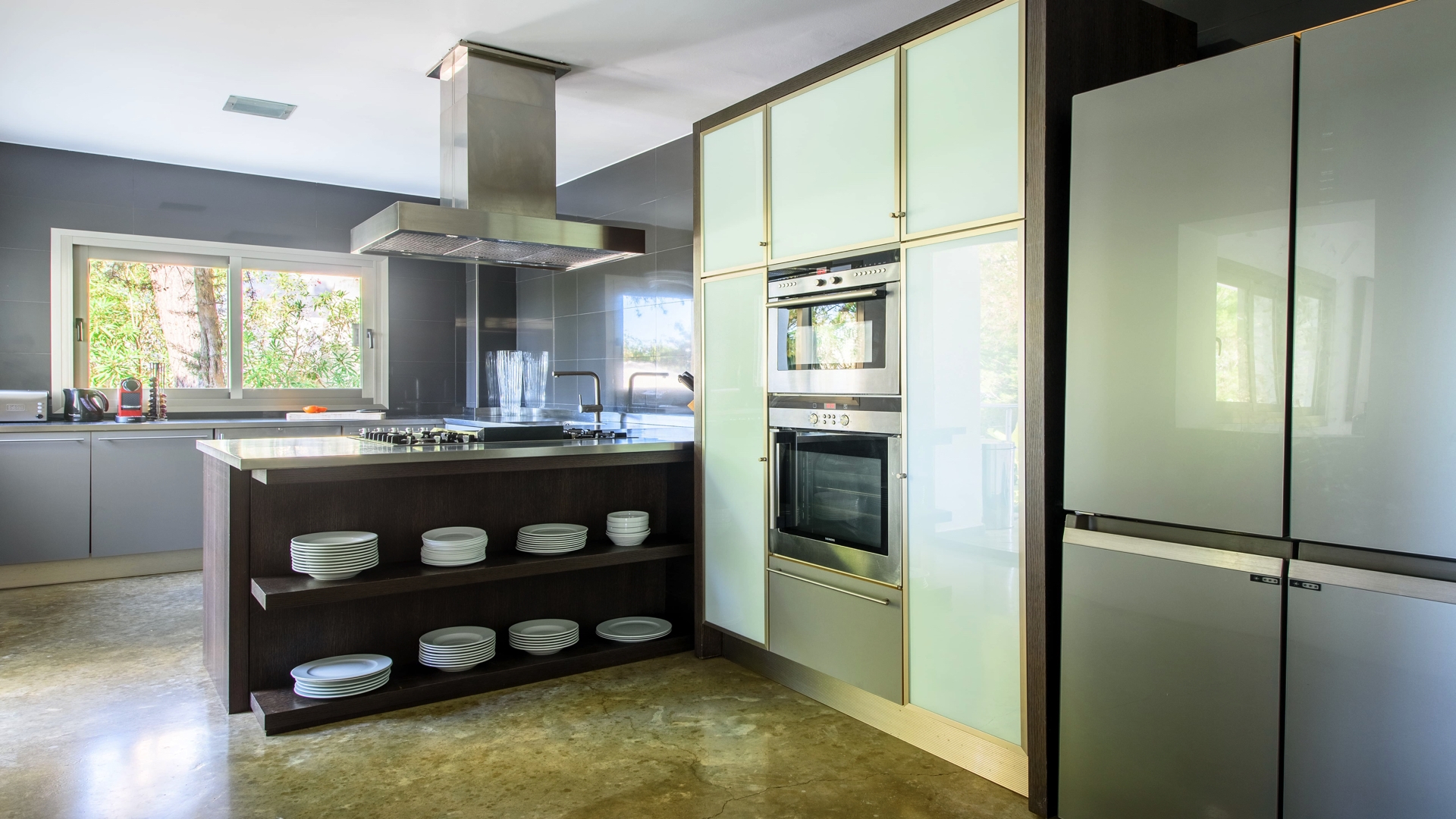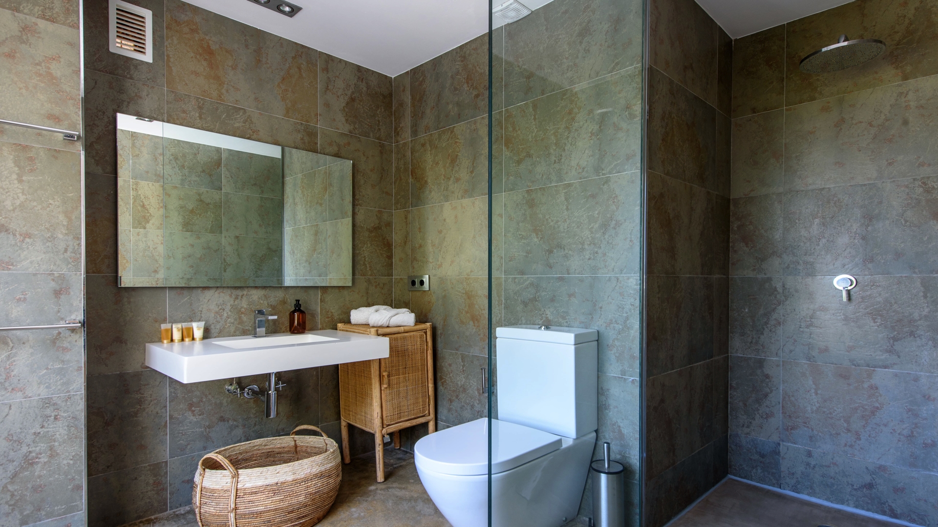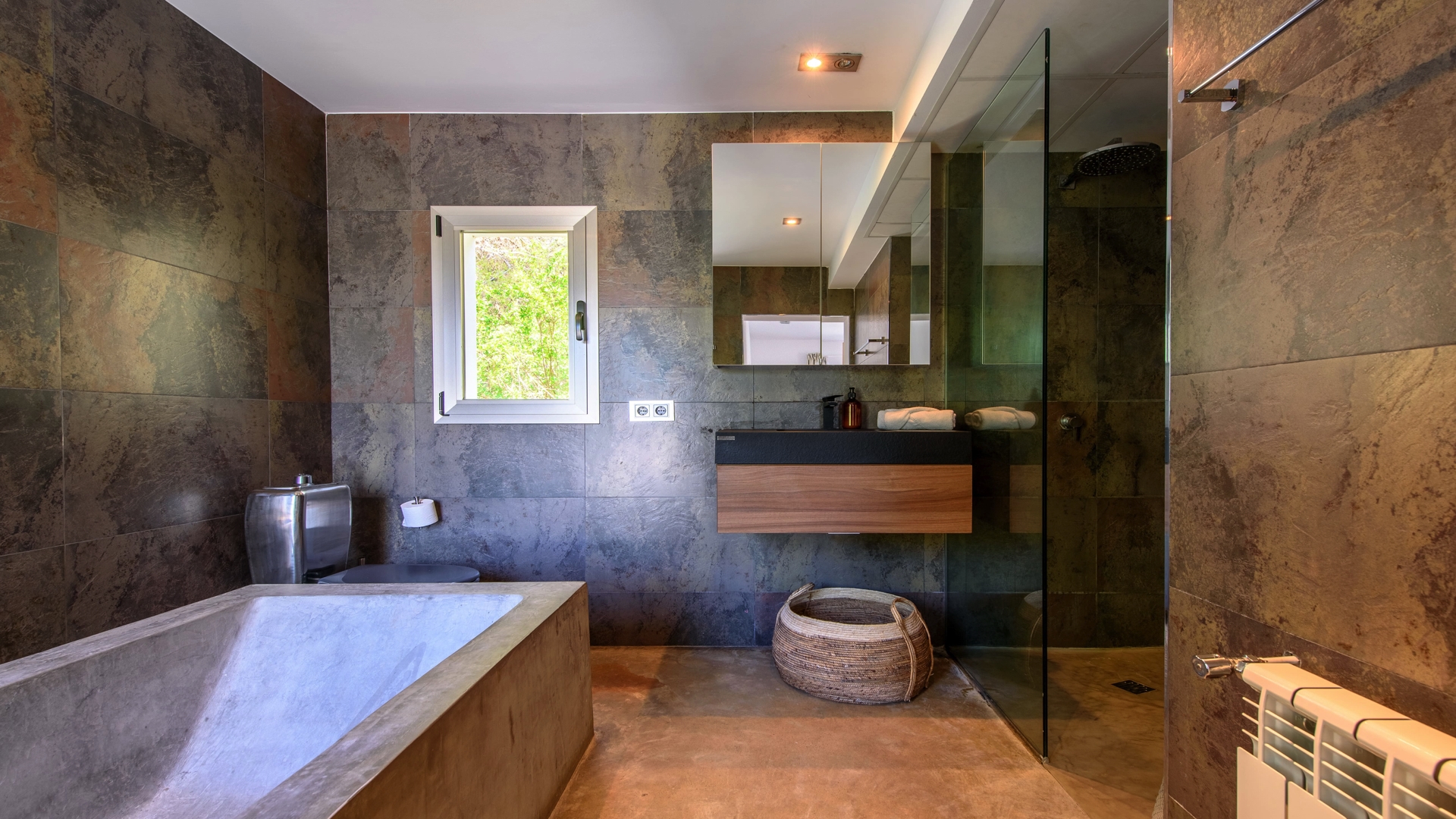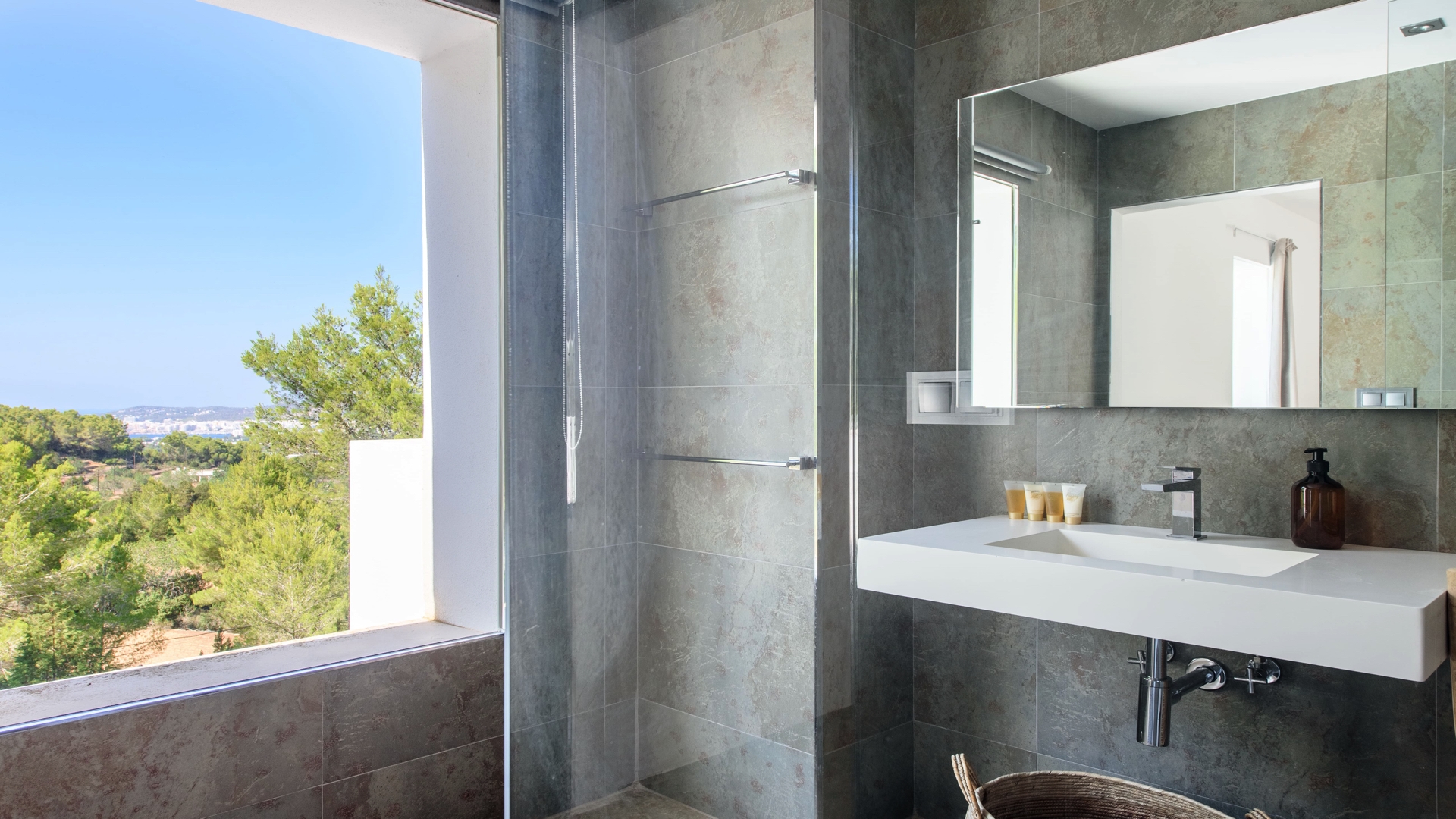 Both the house and the exteriors are in a protected area, which guarantees you incomparable tranquility and privacy and, in addition, you can enjoy the incredible walking or cycling routes in the area. If you prefer to stay and enjoy the comforts of the house, you will love its large swimming pool (12m x 4.5m) and outdoor area that includes several terraces to enjoy the views of the sea and the sunset. It has 6 double bedrooms and capacity to accommodate up to 12 people. It has a spacious living room with views in three directions furnished with an eight meter Capellini sofa, plasma TV with Sky TV, DVD player and an integrated iPod sound system plus four DAS integrated speakers. Although there is an area that we love and we have no doubt that you are going to enjoy it, it is its covered terrace equipped with Minotti pony leather armchairs and a barbecue area from where you can access both the upper garden and the pool terrace. The upper garden has been designed as an orchard with 5 different types of orange, lemon, lime, pomegranate, almond, olive and apricot trees available to customers (depending on the season).